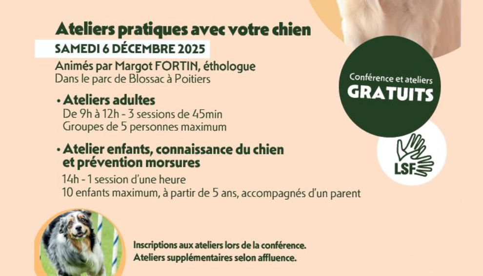 Samedi 6 décembre 2025 : ateliers gratuits pratiques avec votre chien, les inscriptions peuvent se faire lors de la conférence. Des ateliers supplémentaires seront organisés selon l'affluence.