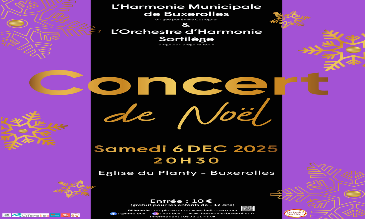 L'Harmonie Municipale de Buxerolles organise son concert de Noël le samedi 6 décembre à 20 h 30 dans l'Eglise Notre Dame du Planty à Buxerolles. A cette occasion, l'Harmonie aura pour invité d'honneur, l'Orchestre d'Harmonie Sortilège (+ de 60 musiciens) donc venez nombreux pour cette une belle soirée musicale...