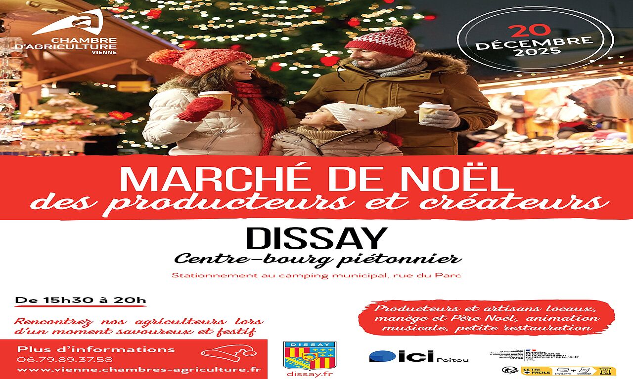 En partenariat avec la Chambre d'Agriculture de la Vienne, et pour la première fois, la mairie de Dissay vous propose un marché de Noël en extérieur. Des producteurs locaux installeront sur leurs étals des produits alimentaires pour préparer vos réveillons festifs. A leurs côtés, des artisans et créateurs seront présents pour satisfaire à vos envies de cadeaux.
