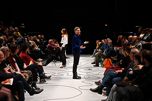 Maguelone Vidal et Maguelone Vidal, les deux homonymes ont imaginé un dispositif où le public fait face au public. Au gré du spectacle, les deux performeuses engagent les spectateurs à décliner leur identité pour que les chanteurs intègrent leurs noms à ce qu’elles appellent la « partition nominale ». « La musique de notre nom nous convoque toute notre vie. C’est notre musique fondamentale », écrivent-elles. Un nom qui s’accorde au pluriel comme au singulier, pourrait-on ajouter. Des noms qui forment des accords aussi, étant donné l’importance de la dimension musicale.