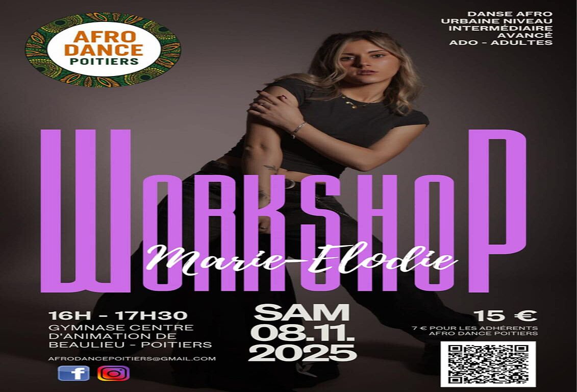 L'Association Afro Dance Poitiers vous propose un workshop de dance afro urbaine, le samedi 8 novembre 2025, de 16 h 00 à 17 h 30, avec Marie-Elodie, danseuse formée sur Paris, désormais professeur de danse. Niveau intermédiaire / avancé ; ado / adultes.